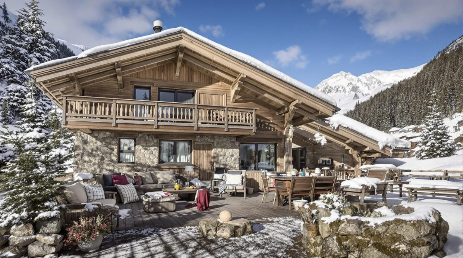 Spécifiquement conçus pour les passionnés de ski, ces chalets de luxe offrent un accès direct aux pistes (ski-in/ski-out), et sont équipés de piscines intérieures et de spas pour des moments de détente après une journée sur les pistes. Le design contemporain de ces propriétés se marie parfaitement à l’architecture traditionnelle des chalets alpins, offrant ainsi une vue imprenable sur les montagnes environnantes.